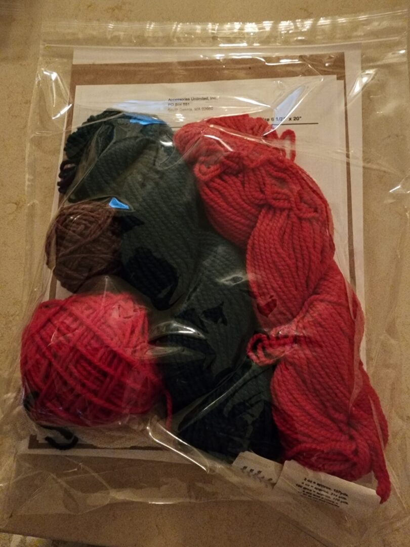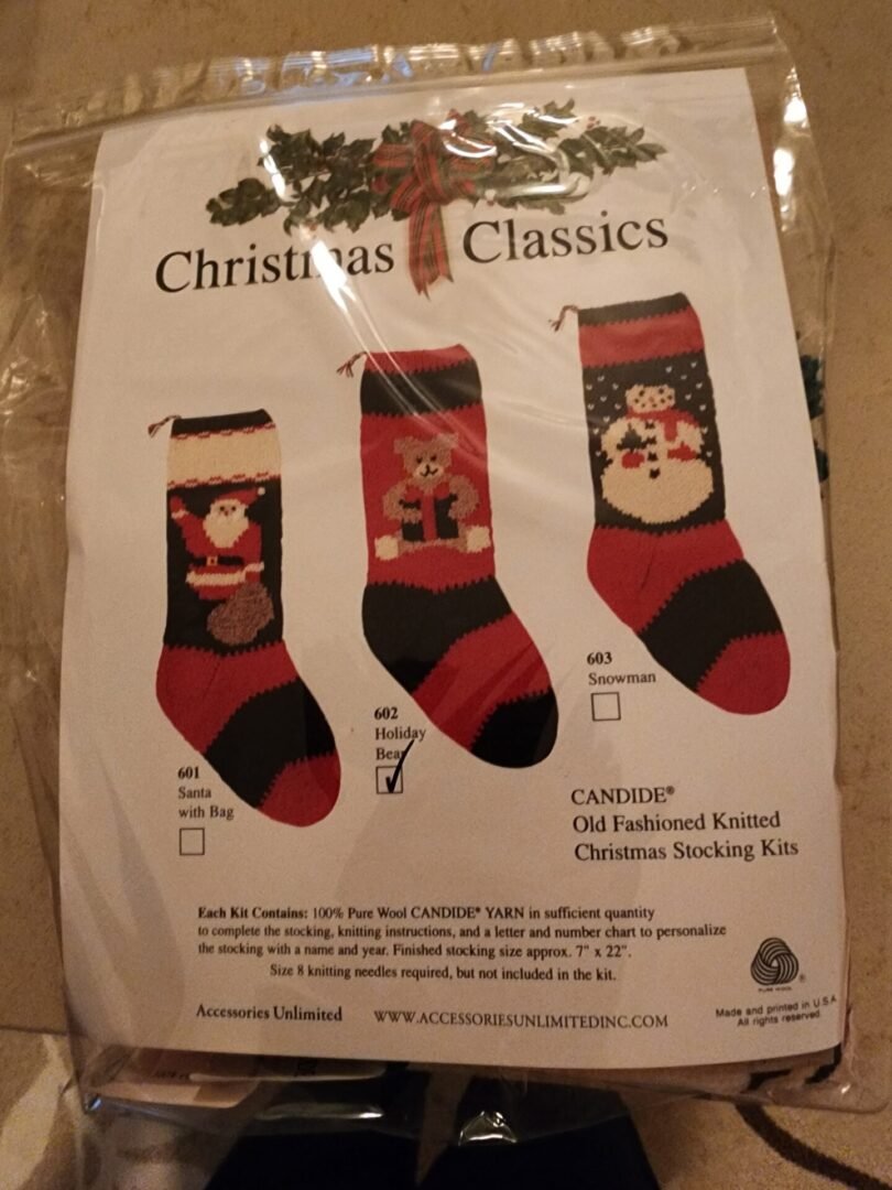 The Christmas Stocking Knitting Kit -Holiday Bear contains the wool yarn, instructions, and chart. The yarn is enough to complete the project. The stocking when finished is 7″ x 2.5′. Two #8 Knitting needles are needed, but not included in the kit.