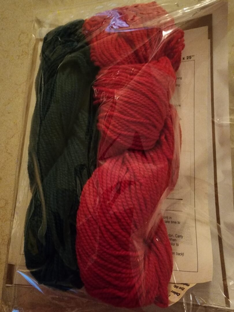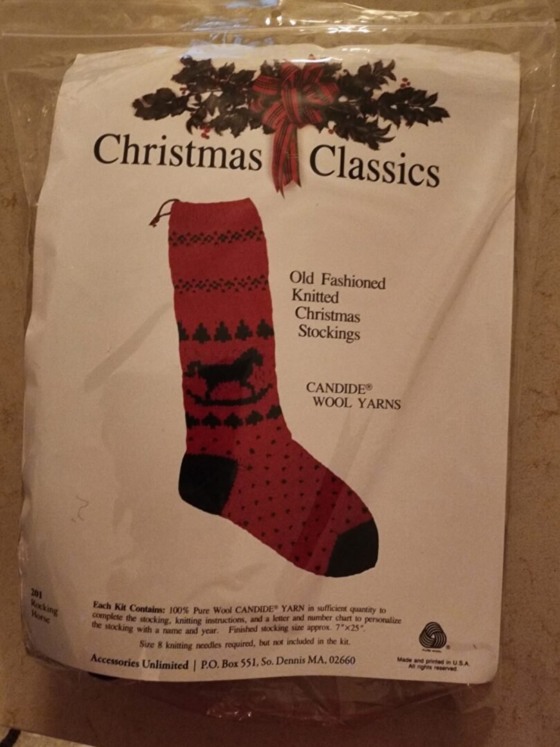 The Christmas Stocking Knitting Kit -Rocking Horse contains the wool yarn, instructions, and chart. The yarn is enough to complete the project. The stocking when finished is 7″ x 2.5′. Two #8 Knitting needles are needed, but not included in the kit.