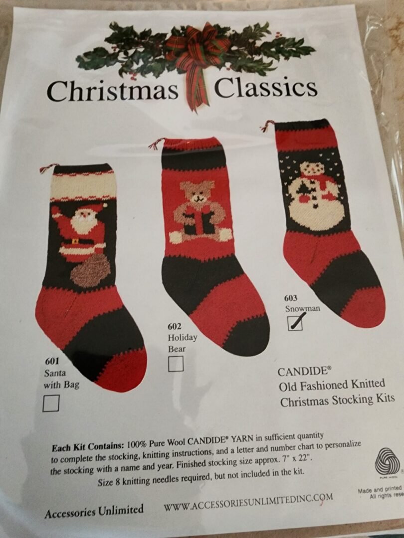 The Christmas Stocking Knitting Kit -Snowman contains the wool yarn, instructions, and chart. The yarn is enough to complete the project. The stocking when finished is 7″ x 2.5′. Two #8 Knitting needles are needed, but not included in the kit.